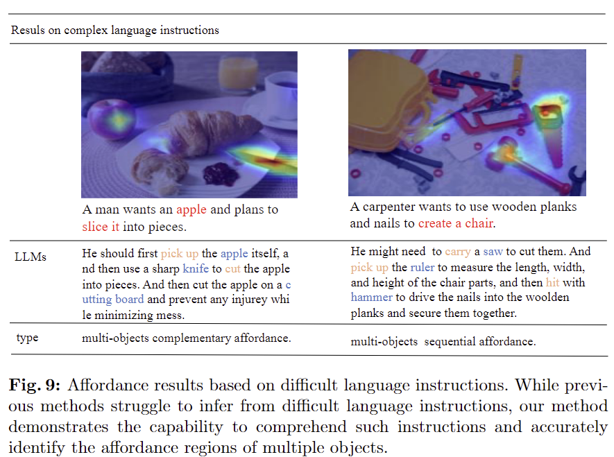 - 복잡한 언어 지시를 기반의 affordance grounding에 대한 분석으로, 저자들이 제안한 문제는 단순 명령어와 다르게 사람의 지식에 대한 이해가 피료앟ㅂ니다.
