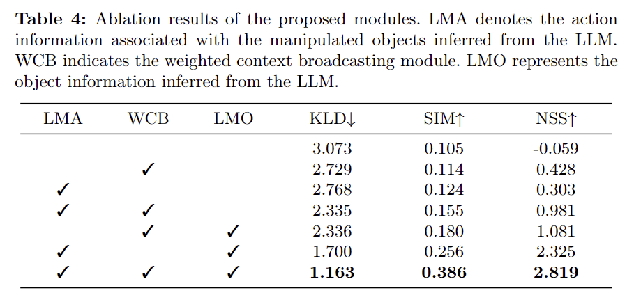 - Table 4는 Ablation study 결과로, ARCoT를 통해 LLM으로 추론된 객체에 대한 정보(LMO)와 행동에 대한 정보(LMA)가 모두 성능 개선에 도움이 되었음보였습니다.