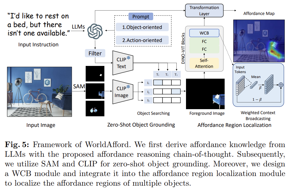 본 논문은 낮은 training cost를 들여 복잡한 지시문을 이해하고 다중 객체의 affordance 영역을 인식하기 위한 WorldAfford 프레임워크를 제안하였습니다. 위의 Fig. 5를 통해 해당 프레임워크를 확인하실 수 있으며, WorldAfford는 먼저 LLM을 통해 사용자의 지시문을 분석한뒤, Chaion-of-Thought 프롬프트를 통해 affordance에 대한 지식을 구합니다. 이후 SAM과 CLIP을 활용하여 zero-shot 기반의 다중 객체의 위치를 인식을 수행한 뒤, LLM이 제공하는 지식과 관련된 객체에 대한 segmentation과 선택을 수행합니다. 또한 Weighted Context Broadcasting(WCB) 모듈을 affordance region localization 모듈에 통합하므로써 다중 객체의 affordance 영역을 인식합니다.
