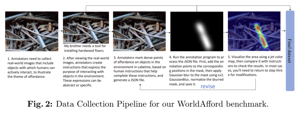 새로운 문제 정의에 대한 연구와 벤치마킹을 위해 저자들은 550개의 복잡한 scene 이미지와 영상에 대응되는 자연어 지시문과 수동으로 라벨링된 affordance map으로 구성된 데이터 셋 LLMaFF를 제안합니다. 데이터 셋 수집 파이프라인은 위의 이미지 Fig. 2와 같으며, Sparse한 GT 포인트로부터 가우시안 커널을 적용하여 GT를 생성한 AGD20K와 다르게 LLMaFF는 지시문에 대한 여러 객체의 affordance map을 제공하기 위해 dense point를 사용하였다고 합니다.(Fig. 2의 3번 이미지를 확인하시면 객체 영역에 여러 점을 찍어 GT를 생성하는 것을 확인하실 수 있습니다.) 데이터 수집 과정은 여러 객체가 존재하는 real-world의 이미지를 수집한 뒤, 어노테이터가 영상에 대한 상호작용을 고려하여 지시문을 자유롭게 생성합니다. 이후 지시문에 해당하는 영역에 dense한 점을 찍어 json 파일을 만든 뒤, annotation 프로그램을 통해 가우시안 필터를 적용하여 GT mask를 만들어 냅니다. 마지막으로 이에 대해 시각화하여 어노테이터가 지시문에 대응되는 지 검토하고, 조정이 필요하면 3번으로 돌아가 지시문에 해당하는 점을 다시 찍고 이후 과정을 반복합니다. 이러한 어노테이션 방식은 결국 사람의 주관이 들어가게 되는데, 이에 대한 검증은 따로 없어보입니다. (AGD20K도 마찬가지로 어노테이터의 주관이 들어가며, 이를 인정을 받을 수 있을지는 해당 논문이 어디에서 accept 되는 지를 보고 파악해야할 것 같습니다.. 아직은 어디에 붙었다는 정보를 찾지 못했습니다..)