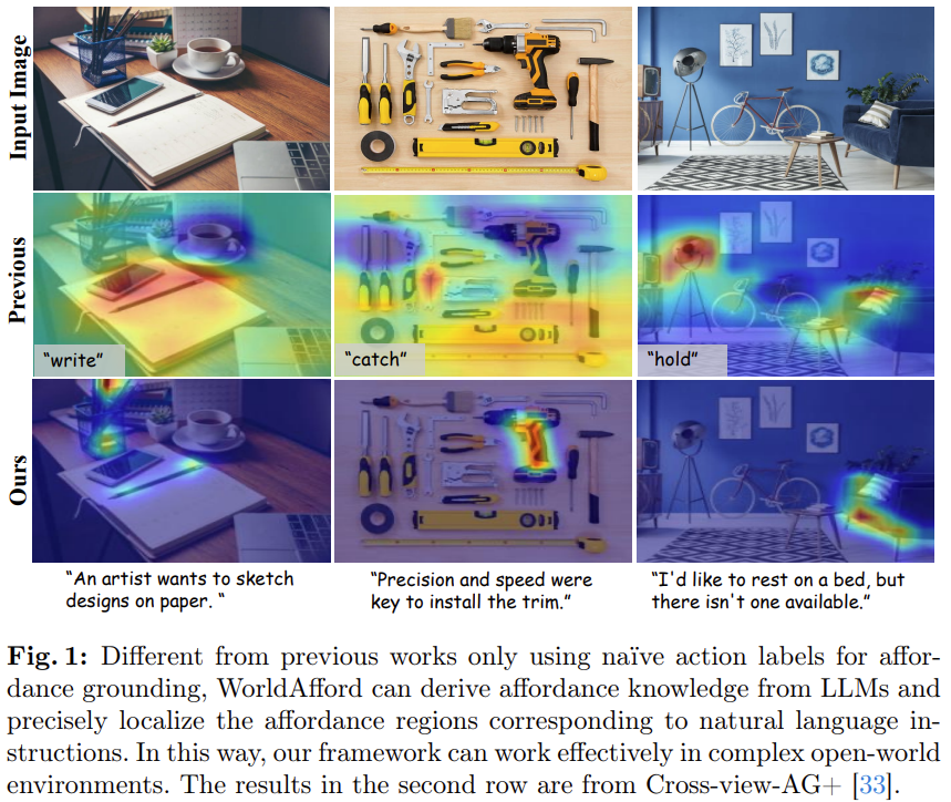 따라서 해당 논문은 최초로 Natural Language Instructions 기반의 Affordance Grounding이라는 작업을 정의하여, 단순한 action label을 사용하던 기존 연구(Fig.1의 2행과 같이 “write”, “catch”, “hold”라는 단순한 action을 사용함)를 복잡한 자연어 로 확장(Fig.1의 3행과 같이 이미지에 대해 자연어 지시가 사용됨)하였습니다. 이를 위해 저자들은 LLM(해당 논문은 GPT-4를 이용합니다)과 SAM, CLIP을 통합한 새로운 프레임워크 WorldAfford를 제안하였습니다. 먼저 LLM을 통해 자연어 지시를 처리하였으며, 이때 Affordance에 대한 지식을 보다 정확하고 논리적으로 추론하기 위해 Affordance Reaoning Chain-of-Thought Prompting(AARCoT)을 새로 디자인하였습니다. 이후 SAM과 CLIP을 활용해 LLM이 추론한 행동과 관련된 객체를 인식하도록 하며, Weighted Context Broadcasting(WCB)모듈을 제안하여 affordance 영역을 착는 모듈에 통합하므로써 풍부한 정보를 제공하는 객체에 집중하고 여러 객체들의 영역을 인식할 수 있도록 하였다고 합니다. 저자들은 Natural Language Instruction 기반의 Affordance Grounding 문제를 새롭게 정의하며 이에 대한 벤치마킹과 제안한 프레임워크를 검증하기 위해 이미지-자연어 지시문-수동 라벨링된 affordance maps로 이루어진 새로운 데이터 셋 LLMaFF를 구축하였으며, 실험을 통해 기존의 Affordance Grounding 연구의 벤치마크 데이터 셋인 AGD20K와 새로 제안한 데이터 셋인 LLMaFF에서 기존 연구를 능가함을 보였습니다.
