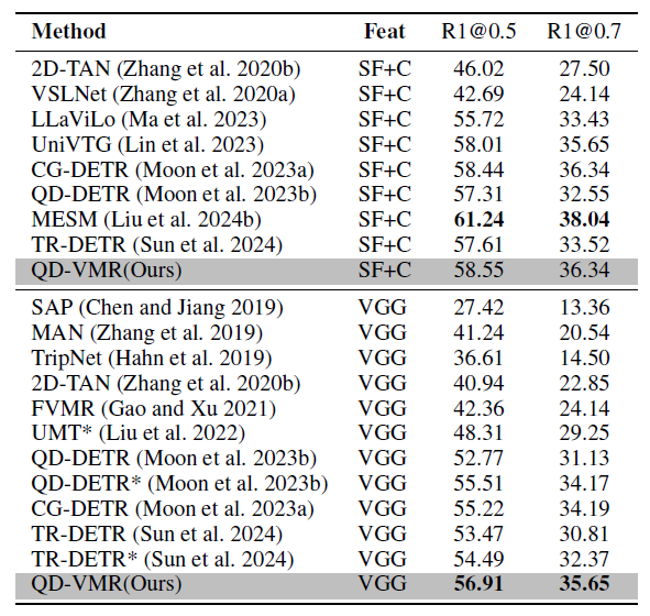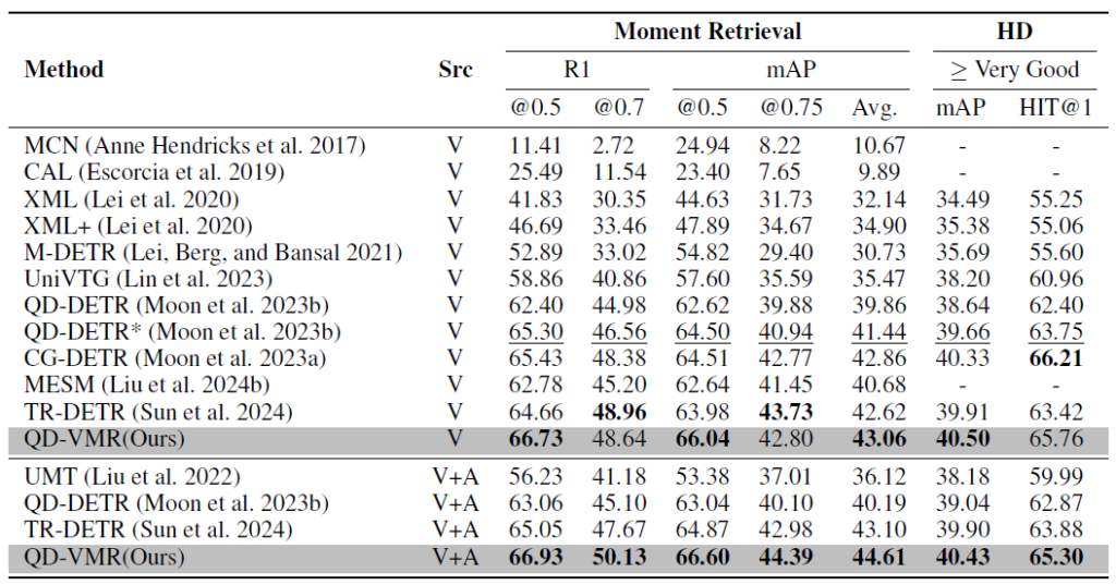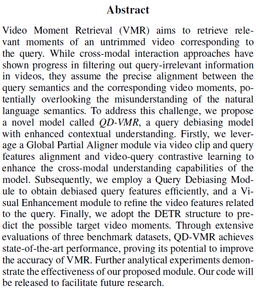안녕하세요 이번 주 X-Review는 arXiv에 업로드되어있는 QD-VMR이라는 방법론입니다. 비디오 분야의 Moment Retrieval task를 수행하며, 포맷상 25년도 AAAI에 제출된 것으로 보입니다. 해결하고자 하는 문제가 제가 지금 보고있는 문제와 유사하여 좀 더 자세히 살펴보게 된 논문입니다. 리뷰 바로 시작하겠습니다.
