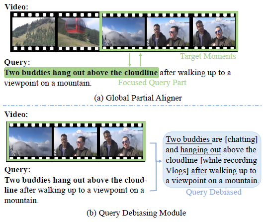 그러한 관점에서 저자가 정의하는 문제점을 그림 1과 함께 살펴보겠습니다. 그림 1-(a)에서 주어진 텍스트 쿼리는 “Two buddies hang out above the cloudline after walking up to a viewpoint on a mountain.”입니다. 비디오의 상응 구간을 보면 실제로 GT 구간은 “Two buddies hang out above the cloudline.” 만을 보여주고 있고, 뒤쪽 문장인 “after walking up to a viewpoint on a mountain.”는 그냥 구간과 관계 없이 앞서 일어난 일을 설명해주고 있습니다. 즉 산을 올라가는 것은 경치를 보기 위한 필요 조건일 뿐 비디오에 등장하진 않지만 텍스트에 포함되어 있다는 것이죠. 저자는 이를 query의 bias라고 표현합니다.개인적인 의견으로 이 정도의 텍스트 쿼리는 잘못 라벨링 되어있는게 아닌가.. 싶긴 하지만 아무튼 주어진 GT이니 모델이 이와 같은 문장의 숨은 맥락 또한 잘 파악해야 좋은 구간을 찾아낼 수 있다고 이야기합니다.