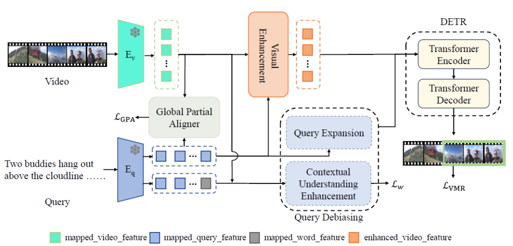 위와 같은 문제들을 해결하기 위해 저자는 Query-Debiasing Video Moment Retrieval (QD-VMR) 모델을 제안합니다. 먼저 비디오와 문장 간 상호작용을 통한 cross-modal alignment 향상을 위한 Global Partial Aligner (GPA) 모듈, 앞서 언급한 쿼리의 bias를 최소화하기 위해 텍스트의 정보를 enhance 해주는 Query Debiasing Module (QDM), 마지막으로 비디오 정보를 enhance 해주기 위한 Visial Enhancement (VE) 모듈을 제안합니다.