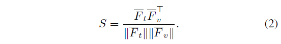 본 GPA 모듈의 목적은 두 모달간 상호작용을 통해 모델의 이해력을 높이는 것입니다. 해당 모듈에서는 비디오 feature \bar{F}_{v}와 온전한 텍스트 feature \bar{F}_{t}가 활용되며 두 feature의 시공간적 이해 능력을 향상시키기 위해 아래와 같이 코사인 유사도를 구할 수 있습니다.