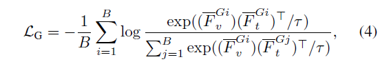 추가적으로 아래 수식 (4)와 같이 배치 B 내 비디오 feature 간 contrastive learning을 위한 loss \mathcal{L}_{G}를 제안합니다.