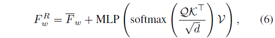 앞선 2.3절에서 텍스트 쿼리의 표현력을 개선해주었다면 본 절에서는 절의 이름을 따라 비디오 feature의 표현력을 개선해주게 됩니다. 여기서는 기존 방법론인 TR-DETR을 따라 앞서 수식 (2)에서 얻은 유사도 S를 활용합니다. S에 대해 column 축으로 softmax를 태워 S_{c}를 얻고, row 축으로 softmax를 태워 S_{r}을 얻을 수 있습니다. 이후 아래 수식 (8), (9)와 같은 연산을 수행해줍니다.