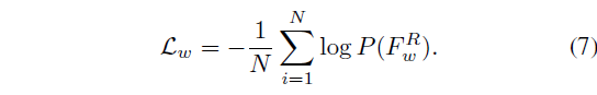 가려진 단어를 맞추기 위해, 위 수식 (6)과 같이 attention 연산을 수행합니다. 이 때 query는 비디오 feature \bar{F}_{v}, key, value는 텍스트 feature \bar{F}_{t}로부터 만들어냅니다. 이렇게 reconstruct된 feature F_{w}^{R}을 P(\cdot{})=MLP+Softmax에 태워 \mathbb{R}^{N \times{} L_{vocab}} 형태의 예측 확률 분포를 얻어냅니다. 이후 가려진 단어가 무엇이었는지 알고 있으니 아래 수식 (7)과 같이 분류 학습을 진행합니다.