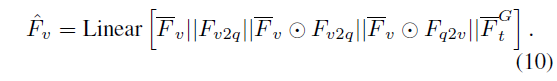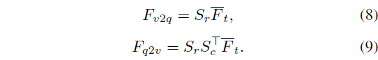 수식 (8)은 video-to-query feature로, clip-level textual feature이고, 수식 (9)는 query-to-video feature로 word-level visual feature입니다. 즉 유사도로부터 추출한 상대 모달리티의 attention map을 모달 feature에 곱해주는 것입니다. 수식 (8), (9)의 출력 모두 L \times{} D 형태의 매트릭스가 됩니다.