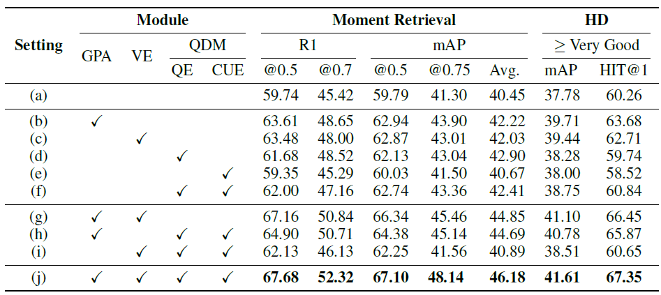 표 4는 QVHighlights val split에서의 모듈별 ablation 성능입니다. 우선 앞서 제가 아이디어로서 제안하려 했었던 간단한 GPA 모듈이 여러 조건에서 굉장히 큰 성능 향상을 불러오는 것을 볼 수 있습니다. 동일한 contrastive learning 방식을 좀 다르게 적용해보는 것도 좋은 contribution으로 이어낼 수 있을 것 같습니다. 또한 (e)의 성능을 보면 CUE만 적용했을 때 기존 베이스라인 성능보다 더욱 떨어지는 것을 알 수 있는데, 단순히 masking한 단어를 복원하는 것만으로는 별다른 효과를 보지 못했음을 알 수 있었습니다.