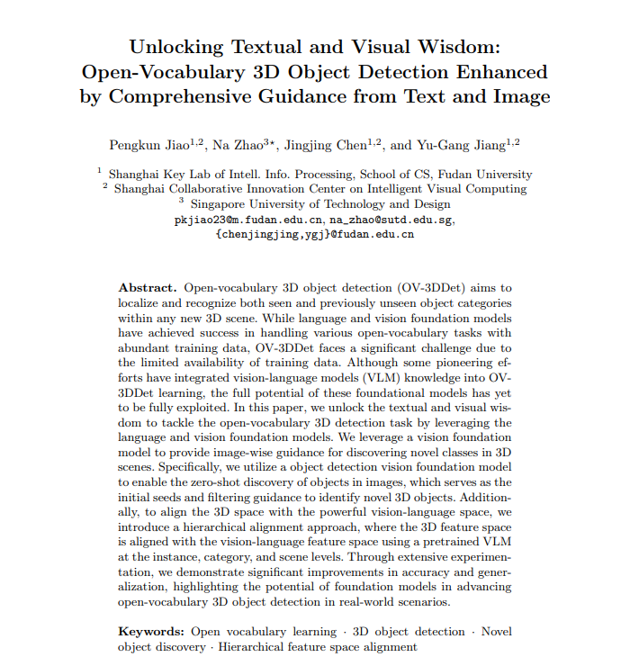 안녕하세요, 마흔 네번째 x-review 입니다. 이번 논문은 2024년도 ECCV에 게재된 Unlocking Textual and Visual Wisdom: Open-Vocabulary 3D Object Detection Enhanced by Comprehensive Guidance from Text and Image 입니다.