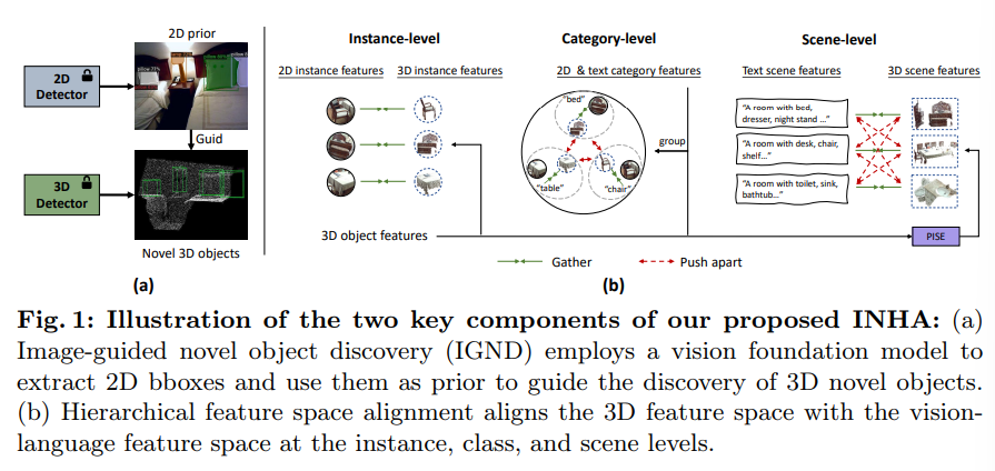 이런 기존 방법론들의 한계점을 해결하기 위해 본 논문에서는 새로운 Image-guided Novel class discovery and Hierarchical feature space Alignment (INHA)라는 방법론을 제시하여, FM을 사용해서 OV-3DET를 위해 텍스트와 이미지 정보를 최대한 활용하고자 하였습니다. Fig.1을 보시면 INHA는 크게 두 가지 구성을 나뉘는데, 먼저 Fig.1(a)와 같이 VFM의 일반화된 성능을 활용하고자 기존 이미지 레벨에서의 OV 검출기를 사용하여 먼저 이미지에서 물체를 먼저 찾습니다. 찾은 물체의 중심 픽셀을 초기 시드 개념으로 활용하여 추가적인 3차원 물체 proposal을 생성하고, 이미지 바운딩 박스를 신뢰할 수 있는 새로운 물체를 선택하는데 사용하고 있습니다. 발견한 새로운 물체는 기존의 물체들과 합쳐서 3차원 검출기를 재학습함으로써 class-agnostic한 검출기 성능을 향상시킬 수 있었다고 합니다.