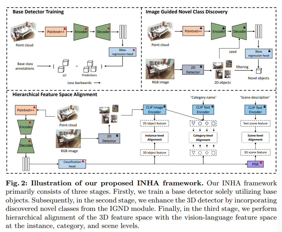Fig.2가 INHA의 전체적인 프레임워크인데 여기서 pointnet++과 Encoder, Decoder는 기본적으로 3DETR 구조를 따르고 있습니다. INHA의 학습 프레임워크를 크게 세 가지로 나눌 수 있습니다.