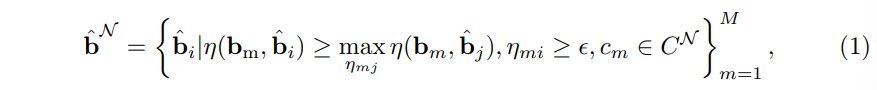 포인트와 이미지 사이의 같은 장면 안에서의 기하학적인 상관관계는 두 검출기의 결과를 연결할 수 있는 요소로 간주할 수 있습니다. 그래서 먼저 예측한 3차원 물체 박스를 \hat{3D}를 이미지 좌표로 사영합니다. 그 사영된 박스를 \hat{b}로 정의하고나서 2D 물체의 가이드에 따라 새로운 물체를 찾게 됩니다. 이미지에서 검출한 2D 박스 b_m에 대해 \hat{b}와 가장 많이 겹치는 박스를 매칭합니다. 그러고 나서 임계값을 걸어서 매칭된 샘플을 필터링하거나 혹은 베이스 물체에 포함된다면 제외합니다. 이렇게 새로운 물체를 선택하는 기준을 식(1)과 같이 정리할 수 있습니다.