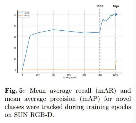 Tab.4에서 또 하나 볼 수 있는 것은 계층적인 feature alignment 방식의 효과 입니다. instance부터 각 레벨의 alignment를 맞추는 과정을 거칠 수록 점진적으로 성능이 향상되는 것을 확인할 수 있습니다. 또한 Fig.5에서도 마찬가지로 계층적인 모달리티 feature 공간 alignment를 활용하면 IGND만을 적용했을 때 보다 novel 클래스에 대해서 높은 mAP를 달성한다는 것을 알 수 있습니다.