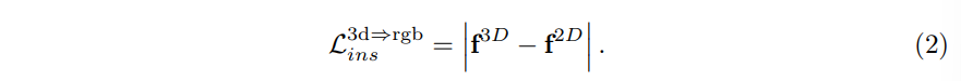 f^{3D}가 3차원 물체 feature이고 f^{2D}가 VLM인 CLIP으로부터 만들어진 crop된 이미지 feature라고 할 때, 식(2)와 같이 두 feature를 L1-norm loss를 사용해서 계산합니다.