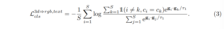 구체적으로 세 가지 모달리티의 feature 집합 S의 각각 feature들을 \{g_i\}^S_{i=1}로 나타내고 \{c_i\}^S_{i=1}로 그 feature들에 대한 클래스 라벨을 정의합니다. 이 집합 안에서 같은 클래스 샘플로 positive 쌍을 구성하고, 다른 클래스 샘플들로 negative 쌍을 구성해서 식(3)와 같은 contrastive loss를 계산합니다.
