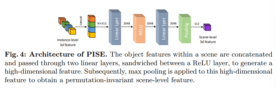 그 다음으로 scene 레벨에서 3D feature는 아직 추출하지 않았기에 이를 위해 Permutation-Invariant Scene-level feature Extraction (PISE) 모듈을 도입합니다. 이 모듈을 통해 장면 내 각각의 물체 레벨 3차원 feature를 합치고 합친 feature을 고차원의 공간으로 사영합니다. 이 과정에서 permutation invariance를 위해 Fig.4처럼 모듈 안에서 고차원의 feature에 대해 max pooling을 적용합니다.