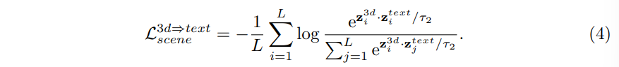 PISE 모듈을 타고 나온 3D feature z^{3D}와 앞서 생성한 텍스트 scene feature 사이의 align을 맞추기 위해 식(4)와 같이 contrastive loss를 계산합니다.