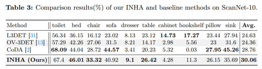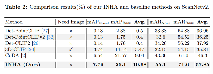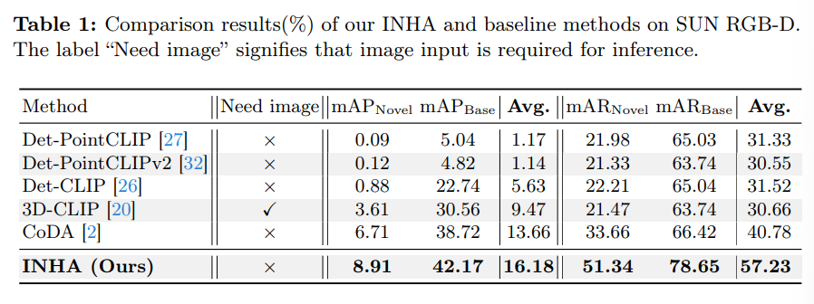 Tab.1은 SUN RGB-D에서의 결과로 base 클래스와 새로운 클래스에 대해 모두 본 논문의 방법론이 가장 높은 성능을 달성하였습니다. 특히 SOTA 방법론인 CoDA와 비교했을 때 mAP_{novel}에서의 거의 30% 이상, mAP_{Base}에서도 10% 이상의 성능 차이를 보이고 있는데요, 이는 INHA가 기본적으로 더 물체를 잘 검출할 뿐만 아니라 vision-language feature와 feature space의 align을 맞추었기 때문이라고 강조하고 있습니다.