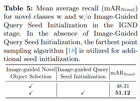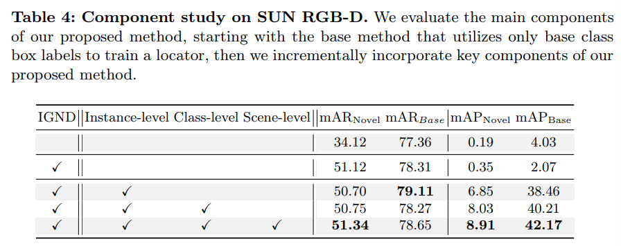 제시한 INHA 방법론에서 우선 IGND 모듈의 효과를 ablation study로 보여주고 있습니다. IGND 모듈을 추가함으로써 새로운 물체를 발견하는데 많은 도움이 된다는 걸 mAR_{Novel}을 통해 성능적으로 확인할 수 있습니다. 앞서 방법론에서 Fig.5를 통해 recall 비율을 향상시킬 수 있다는걸 보여주었었습니다. 이런 mAR의 성능 향상을 통해 이미지 기반의 새로운 물체를 발견하는 모듈의 효과를 강조할 수 있습니다.