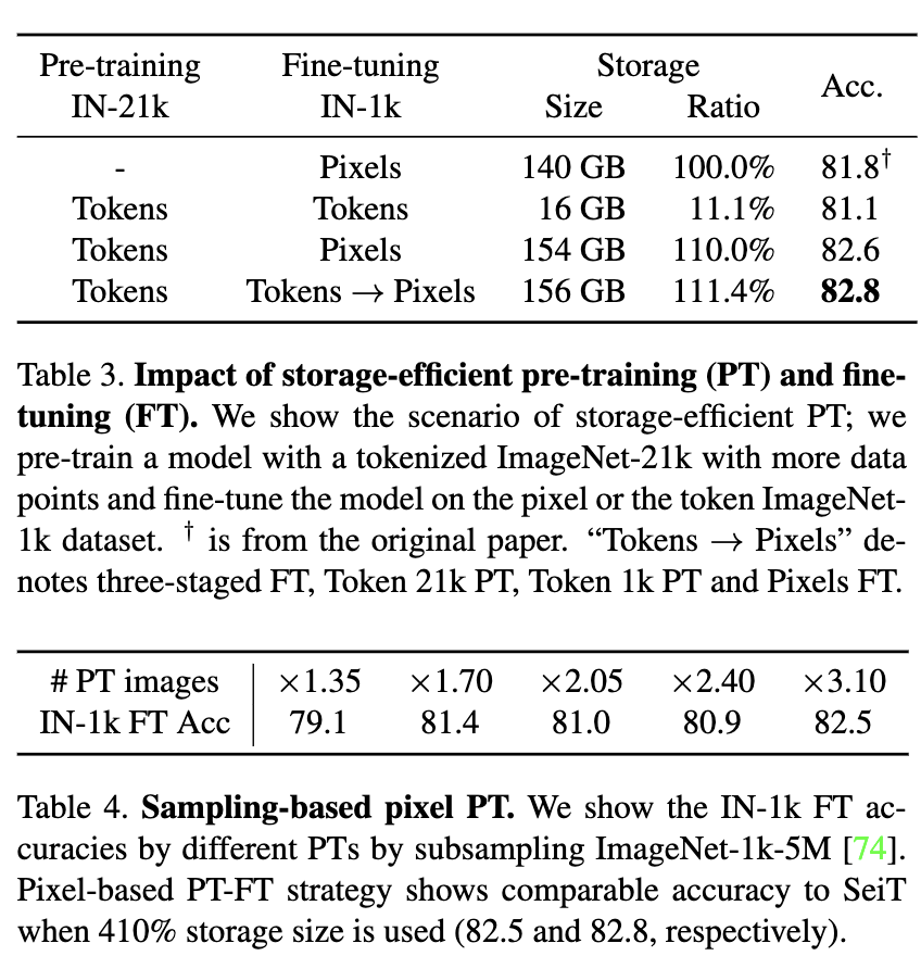 저자는 ImageNet-21k 데이터셋에서 토큰을 추출하고, 토큰화된 ImageNet-21k에서 ViT-B/16 모델을 사전 학습하여 사전 학습으로서의 토큰의 효과를 확인했습니다. 그런 다음, 사전 학습된 모델을 각각 토큰화된 ImageNet-1k와 픽셀 기반 ImageNet-1k로 미세 조정했습니다. 추가적으로, storage-efficient 사전 학습을 세 단계로 확장하여, 21k 토큰 사전 학습 → 1k 토큰 사전 학습 → 1k 이미지 미세 조정의 과정을 거칩니다.