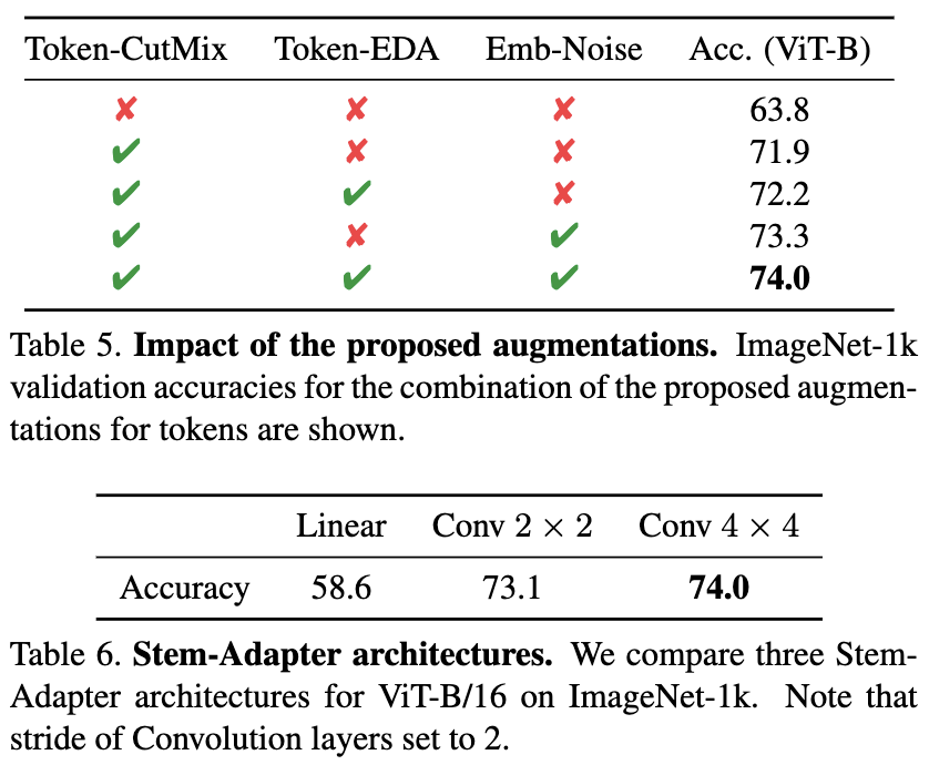 저자는 제안된 증강 방법, Stem-Adapter 아키텍처, 그리고 컨볼루션 네트워크에 대한 결과를 분석합니다. 표 5는 토큰을 위한 제안된 증강의 영향을 보고합니다. 저자는 Token-CutMix를 사용함으로써 전체 학습 절차가 안정화되고, 제외했을 때보다 8.1%의 가장 큰 성능 향상을 가져왔다는 것을 발견했습니다. 토큰을 위한 새롭게 제안된 Embedding-Noise와 Token-EDA도 각각 0.3%와 1.4%의 성능 향상을 보였습니다. 흥미롭게도, 이러한 방법들은 개별적으로 사용될 때뿐만 아니라 결합하여 사용될 때도 효과적으로 작동하며, 더 높은 성능(74.0%)을 달성했습니다.