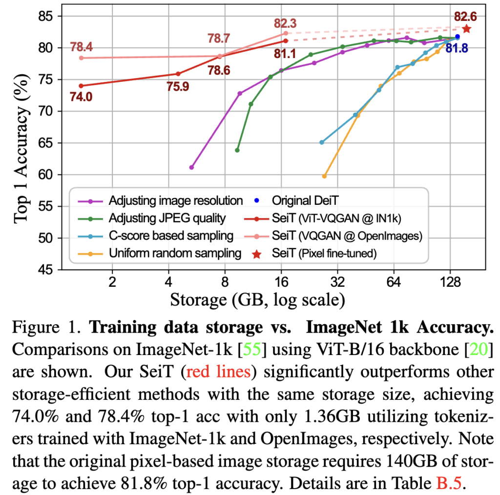 Contributions: (1) 저자는 사전 학습된 비주얼 토크나이저를 사용하여 이미지를 1024개의 이산 토큰으로 압축했습니다. 토큰에 간단한 압축을 적용하여, 픽셀로 저장된 이미지와 비교해 저장 용량을 0.97%로 줄였습니다. (2) 저자는 기존 ViT 학습의 프로토콜과 하이퍼파라미터를 최소한으로 변경하여 ViT 학습이 가능하도록 Stem-Adapter 모듈과 Token-RRC, Token-CutMix, Emb-Noise, Token-EDA와 같은 토큰 증강 방법을 제안했습니다. (3) 저자의 storage-efficient 학습 파이프라인인 Storage-efficient Vision Training (SeiT)은 적은 저장 환경에서 성능 향상을 보여줍니다. 원래 저장 용량의 1%만으로 SeiT는 ImageNet-1k에서 74.0%의 Top-1 정확도를 달성했습니다. (4) 저자는 추가적으로 SeiT가 storage-efficient 사전 학습 전략과 연속 학습 작업에 적용될 수 있음을 보여주었습니다