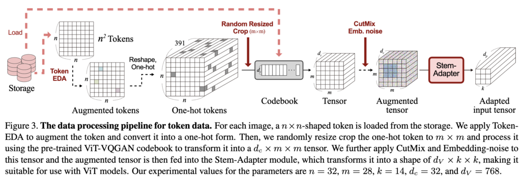 이전 방법들의 모든 단점은 디지털 이미지를 저장하기 위해 너무 많은 인지할 수 없는 비트가 할당된다는 사실에서 비롯됩니다. 저자의 접근 방식은 이미지 대신 토큰을 저장하여 이러한 한계를 극복하며, VQGAN 또는 ViT-VQGAN 토크나이저와 같은 사전 학습된 비전 토크나이저를 사용합니다. 저자는 Storage-efficient Vision Training (SeiT)을 도입하여 각 이미지를 32×32 토큰으로 변환합니다. 각 토큰이 가질 수 있는 가능한 경우의 수(코드북)는 391로, 각 토큰을 저장하는 데 1.15KB만 필요합니다. ImageNet의 140GB 픽셀 기반 저장소를 저장하는 데 1.5GB 미만의 cost가 듭니다. 저자는 최소한의 수정으로 ViT 모델을 토큰화된 이미지에서 학습시킵니다. 먼저, 1024 길이의 토큰화된 이미지를 ViT-VQGAN의 사전 학습된 32차원 코드북 벡터를 사용하여 32×32×32 텐서로 변환합니다. 다음으로, 텐서를 무작위로 크기를 조정하여 32×28×28 텐서를 얻습니다. 그런 다음 ViT가 처리할 수 있는 형태로 텐서를 변환하기 위해 Stem-Adapter 모듈을 도입하여, Stem 계층 이후 ViT의 첫 번째 레이어 입력과 동일한 768×14×14 크기의 텐서로 변환합니다. 이미지 기반 증강은 토큰에 직접 적용할 수 없기 때문에, 저자는 Token-EDA, Emb-Noise 및 Token-CutMix와 같은 간단한 토큰 전용 증강 방법을 제안합니다.