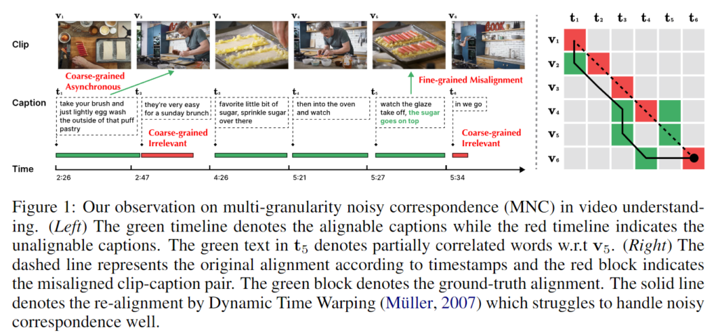 - 저자는 temporal learning(video-language 연구)에서의 coarse-grained asynchronous misalignment, coarse-grained irrelevant misalignment 그리고 fine-grained misalignment 문제를 포함하는 multi-granularity noisy correspondence (MNC)문제를 정의합니다.