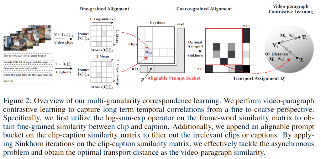 video와 paragraph 사이의 시간적 상관관계를 coarse한 level에서 align하고 위에서 설명한 OT(선형 계획 형태의 OT와 Sinkhorn 알고리즘)을 활용해 유사도를 계산합니다. clip-caption 유사도 행렬에 Sinkhorn 알고리즘을 반복 적용하여 asynchronous misalignment를 해결하고 최적인 이동 거리를 계산합니다. 최적 이동거리(OT)를 활용하여 coarse한 video-paragraph 유사도를 얻을 수 있습니다.