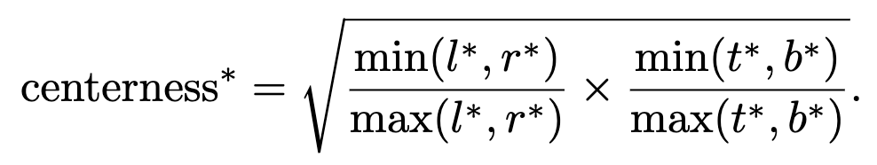 위 수식과 그림과 같이 centerness가 계산됩니다. centerness는 중심에 가까울수록 1의 값을, 중심에서 멀어질 수록 0의 값에 가깝게 가지게 됩니다.