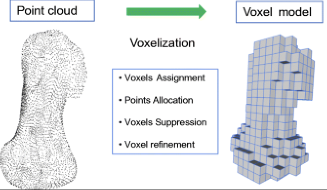 여기서 이런 scalability를 조금 해결하기 위해서 제안된 방식으로 voxel data representation 과 이를 활용한 sparse convolution이 있습니다. voxel은 volume과 pixel을 조합한 혼성어로 3차원 공간에서 정규 격자 단위 값을 의미하고, 아래의 그림과 같이 point cloud로부터 표현될 수 있겠습니다.