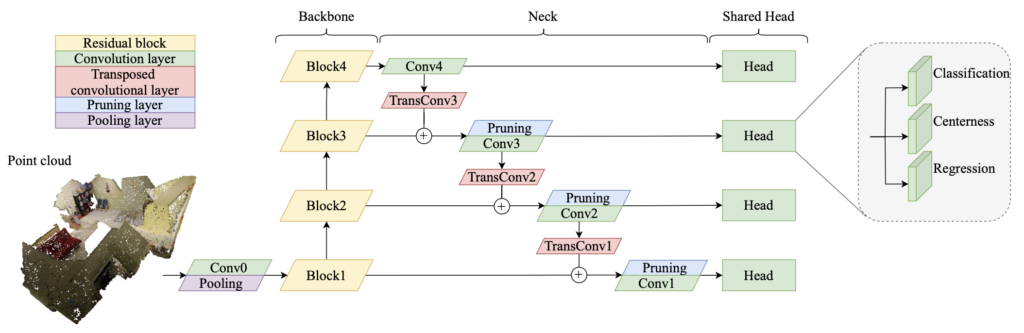 Neck 부분은 GSDN의 decoder 부분을 떼와서 더 효율적으로 활용합니다. GSDN과 다른 점은 GSDN은 pruning layer가 transposed conv 뒤에 나오는 데 반해, FCAF3D는 backbone의 block에서 나온 feature를 pruning layer를 한번 거치고 3D sparse conv를 진행하고, sparse transposed 3D conv를 통해 차원을 늘려 앞단 block과 skip connection을 통해 결합하는 방식을 취합니다. 이 때 pruning layer가 sparse transposed 3D conv 앞에 쓰이는 이유는, 만약 이 transposed 3D conv가 kernel size가 2라면 non-zero인 값이 2^3 배로 증가하며 decoding 되기에 급격한 memory growth가 생길 수 있기 때문에, pruning layer를 일종의 필터로써 앞선 feature에 probability mask와 함께 작용하게 되는 것입니다.