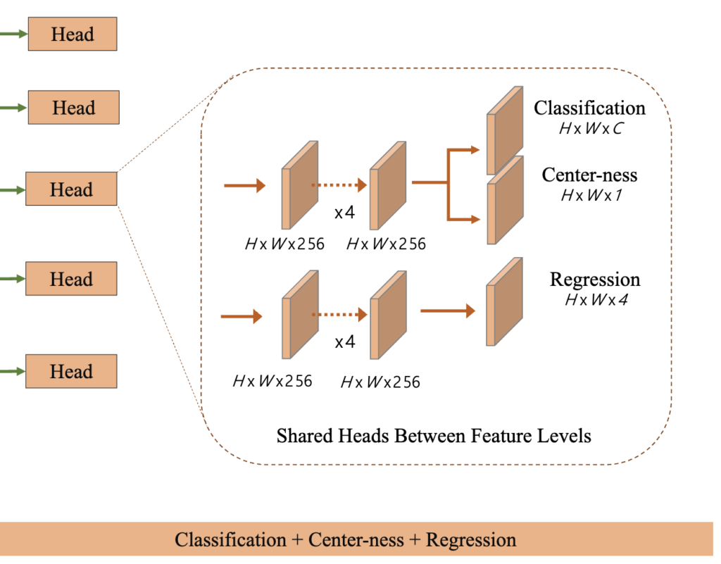 anchor-free FCAF3D head는 feature level 간에 가중치가 공유되는 3개의 병렬 sparse conv layer로 구성됩니다. 각 위치(x^, y^, z^)에 대해 이 레이어는 각각 classification probabilities p^, bbox regression parameters δ, centerness c^를 출력합니다. 이 설계는 FCOS의 단순하고 가벼운 head에서 활용하여 3D 데이터에 맞게 조정되었습니다. FCOS의 head는 아래의 그림과 같습니다.