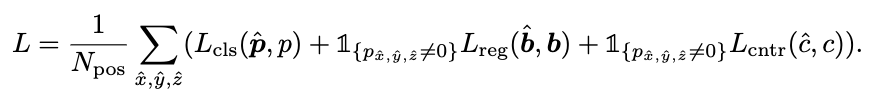 전체 loss는 위와 같습니다. classification loss, regression loss, centerness loss를 합쳐 matching된 locations 수로 나누어줍니다. 특히 수식에서 1{x^,y^,zˆ≠0}는 해당 location이 matching이 되었을 때 1, matching이 되지 않았을 때 0이 되는 값으로 matching된 location에 대해서만 bounding box regression loss와 centerness loss를 포함하여 계산하겠다는 의미입니다. classification loss는 focal loss를, regression loss는 IoU를, centerness loss는 binary cross-entropy loss를 사용한다고 합니다. hat(^)이 붙은 notation이 예측값들입니다.