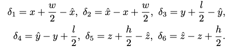 gt AABB(x, y, z, w, l, h)와 location(x^,y^,z^)을 이용해 bounding box regression parameters(δ)는 위의 6개의 값을 가지는 tuple δ로 표현될 수 있습니다. 예측되는 AABB인 b^는 δ로부터 얻을 수 있다고 합니다.