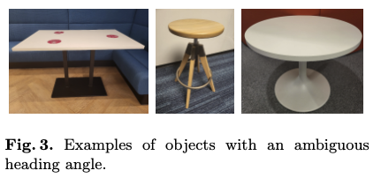 heading angle bin이 선택되면 heading angle value값은 regression을 통해 추정되는데 outdoor scenes의 경우 삼각법을 통해 추정하게 된다고 합니다. 한편 저희가 FCAF에서 집중하고자 하는 indoor scenes의 경우에는 좀 더 복잡한데 object의 heading angle이 모호한 경우가 위의 Fig.3 과 같이 생기게 됩니다. indoor에 존재하는 사각형의 책상과 원형 테이블 같은 경우에는 어느 방향, 어디서 봐도 비슷한 생김새를 띄었기에, 어떤 방향이 heading angle이라고 명확히 말하기 어렵다는 rotation ambiguity 문제가 있습니다.