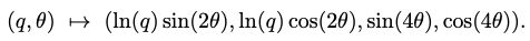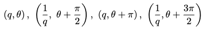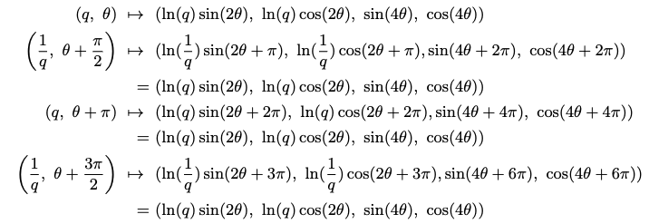 w+l이 고정된 상수이기 때문에 θ(0~2π]와 q(0, +inf)에 관계없이 4개 표현은 Mobius strip(뫼비우스의 띠)와 위상학적으로 동등하다고 표현하고 있습니다. Mobius strip을 생각해보면 시작점을 따라 쭉 진행하다보면 다시 시작점에 도달했을 때 반대 방향에 있을텐데 이처럼 반복되며 계속 같은 위상을 나타낸다는 것을 표현하는 것 같습니다. 결론은 그래서 아래 수식이 위 수식의 4개 표현과 같은 points를 2차원 euclidean 공간의 Mobius strip으로 표현할 수 있다고 합니다.