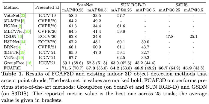 아래 Table 1은 본 논문에서 제안하는 FCAF3D 모델을 기존 3가지 3d indoor benchmark(scannet v2, sun rgb-d, s3dis)의 sota모델들과 비교입니다.