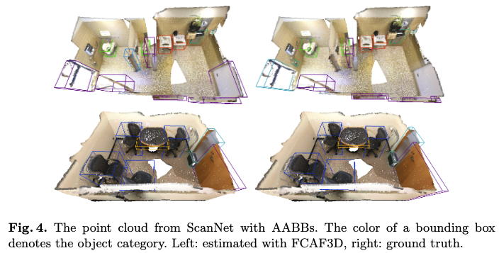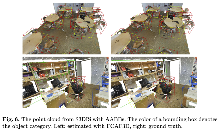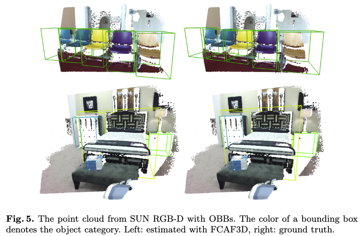 Fig 4,6(ScanNet, S3DIS)은 앞선 dataset에서 설명한 바와 같이, bounding box가 AABB로 표현되는 형태이기 때문에 heading angle이 없어 bounding box가 모두 같은 방향을 가지는 것을 확인할 수 있습니다. 한편 Fig 5(SUN RGB-D)의 경우에는 bounding box가 OBB로 표현되기 때문에 bounding box의 heading 방향이 다른 것을 확인할 수 있습니다.