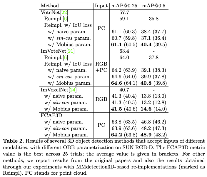 아래 Table 2는 VoteNet, ImVoteNet, ImVoxelNet에서 기존 parametrization을 바꿔 실험한 결과입니다.