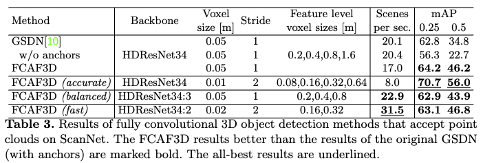 아래 Table 3에서는 3d convolution 방법론이자 FCAF3D의 neck부분에서 사용된 GSDN모델과 본 논문에서 제안하는 FCAF3D와의 비교 결과를 보여줍니다. 첫 행을 보면 두 모델이 서로 동일한 환경에서 실험한 결과인데 FCAF3D가 더 높은 정확도를 보이는 것을 확인할 수 있습니다.