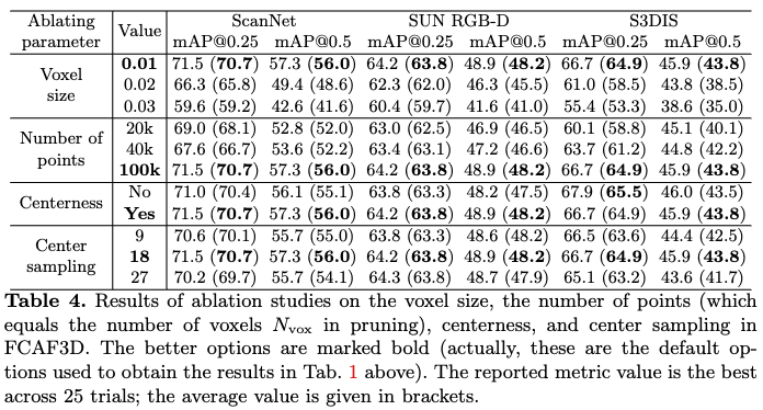 마지막으로 아래 Table 4는 voxel size, point 수, centerness, center sampling에 대한 ablation study입니다.
