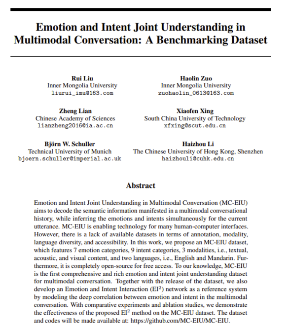 - 처음으로 포괄적이고 풍부한 multimodal conversation emotion, intent joint understandin dataset (MC-EIU)를 제안함.
