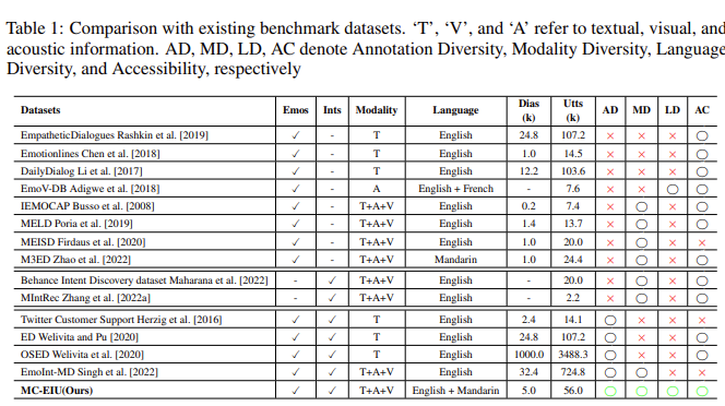 논문의 저자는 위의 문제를 해결하고자 MC-EIU 데이터셋을 제안합니다. 해당 데이터셋은 4가지 요소, 즉, annotation, modality, language diversity, accessibility을 동시에 충족하며, MC-EIU task에 대한 연구를 수행할 수 있도록 합니다.