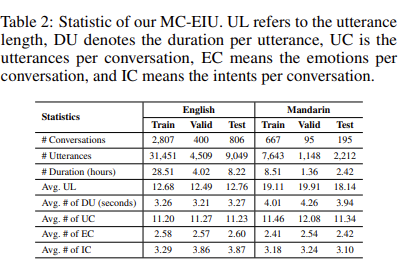 Table 2를 통해서 MC-EIU 데이터셋의 통계를 볼 수 있습니다. 총 56,012개의 발화로 구성되어 있으며, 여기에는 4,013개의 English conversation, 957개의 Madarin conversation으로 구성되어 있습니다. 시간으로 계산으로 총 54.06 시간 분량을 가진다고 합니다. 당연하게도 train, valid, test set을 구성하여서 제공하고 있고, 비율은 7:1:2라고 합니다.