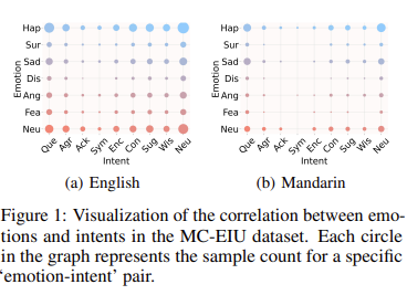 Figure 1(a)를 예를 들면, “Hap-Sym”에 비해서 “Hap-Agr”가 더 높은 빈도로 발생하여 “Agreeing”이 “Happy”의 표현을 이끌 가능성이 더 높다는 것을 나타냅니다. 비슷하게, “Dis-Que”와 비교했을 때, “Sad-Que”는 더 높은 발생률을 보이고 “Questioning”이 “Disgust”에 비해 “Sad”와 더 밀접하게 연관되어 있음을 나타냅니다. 또한, English 데이터셋의 emotion과 intent의 상관관계가 Mandarin 데이터셋에 비해 더 복잡하다는 것을 확인할 수 있는데요. 논문의 저자는 이러한 복잡한 관계가 MC-EIU task에 challenge를 부여한다고 말합니다.