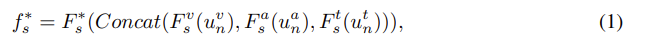 여기서 $s \in \{e, i\}$, $F^a_s$는 LSTM과 max-pooling을 기반으로한 Acoustic Encoder를 의미하고, $F_s^v$는 $F_s^a$와 동일한 구조를 한 Visual Encoder를 의미합니다. $F^t_s$는 TextCNN을 기반으로 한 Text Encoder를, $F^*_s$는 Transformer fusion network를 의미합니다.