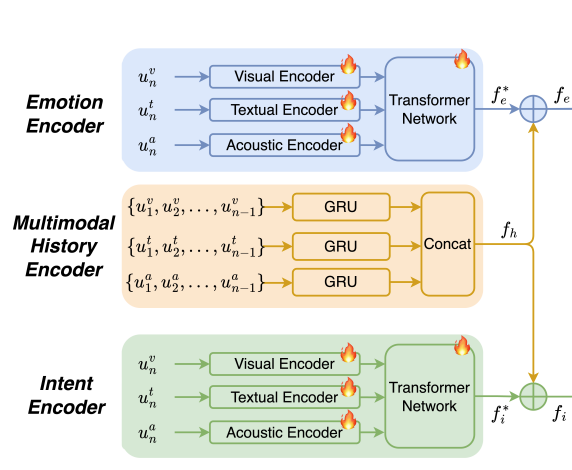 emotion 및 intent encoder는 비슷한 구조로 구성되어 있는데, Visual encoder, Textual encoder, Acoustic Encoder, Transformer fusion network로 구성되어 있습니다. $u^n_a, u^n_t, u^n_v$는 각각 n번째 발화 $u_n$의 acoustic, textual, visual feature를 나타냅니다. multimodal emotion representation $f_e^*$와 intent representation $f^*_i$는 다음과 같이 표현될 수 있습니다.